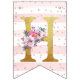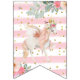 A beautiful unicorns surrounded by delicate flowers. The background of each part has pastel pink and white watercolor brush strokes and sparkling golden or rose glitter dots. Each part has a gold letter with foil effect, forming the words "happy birthday". Ideal for Baby Shower and Children's Birthday parties.