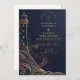 An elegant night-time coastal wedding design featuring a luminous gold lighthouse illustration set against a deep navy backdrop. Flowing ocean waves, celestial accents, and refined metallic linework create a dramatic, high-end atmosphere inspired by seaside evenings and maritime romance.