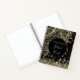 On this stylish sketch book is a gold ornate lotus mandala on a black backdrop with gold stars raining down where on the bottom is a gold glittery edging for extra magic. Whimsical fantasy vibes. Can be customized with a name, phrase or logo to make it uniquely your own.