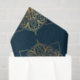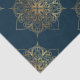 A pattern of beautiful gold mandalas repeated into an ornate damask pattern. The gold is shiny to imitate real gold foil. The mandalas are designed with intricate, hand drawn line work and placed on a deep navy blue background.