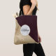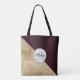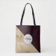A tote bag with a pattern composed of a golden and tan marble pattern with a solid burgundy colour layered diagonally together. A circle with a grey marble interior and a faux gold foil border holds your name and monogram.