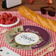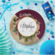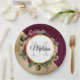 Paper plate with a golden marble pattern with a solid burgundy colour layered diagonally together. A circle with a faux gold foil border overlays a pretty floral bouquet with roses, carnations and other flowers. Personalize with your name and monogram inside the circle.