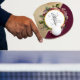 A ping pong paddle with a golden marble pattern and a solid burgundy colour layered diagonally together. A circle with a faux gold foil border which is layered over a pretty floral bouquet with roses, carnations and other flowers. Personalize with your name and monogram inside the circle.