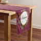 A table runner with a golden marble pattern and a solid burgundy colour layered diagonally together. A circle with a faux gold foil border which is layered over a pretty floral bouquet with roses, carnations and other flowers. Personalize with your name and monogram inside the circle.