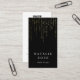 Simple and elegant vertical business card design features classic white lettering on a rich black background with cascades of faux gold foil string lights at the top. Personalize with two lines of custom text on the front, and add your full contact information to the reverse side, along with a customizable QR code.