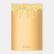 Decorated With bright faux gold glitter drip, paint drip look. Elegant faux gold metallic background. Template for your name in dark golden written with a hand lettered style script.