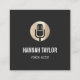 Elegant and unique square business cards for voice actors or actresses, voiceover artists, vocal talent, and audio recording professionals feature a microphone in faux gold foil, on a rich charcoal grey background with two lines of custom text in white. Customize the back with your full contact details, displayed beneath a smaller matching microphone illustration.
