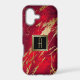 This bright phone case in red and gold almost seems to glow! It features your monogram in gold at the centre of a black square banner which is double lined in shiny gold. The banner is placed on a vivid gradient red background that looks as if it has been splattered with gold metallic paint. Unique and very attractive! *Please note - the metallic look is simulated, and the case does not contain metallic paint, but only the image.
