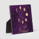 Attractive celestial design features gold moon phases circular illustration on background of purple starry galaxy night sky. Customize with name, or other special message.