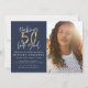 Making 50 look good photo birthday invitation. Modern script text navy blue and gold effect design. Part of a collection.