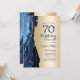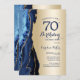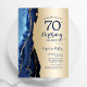 Navy blue and gold agate 70th birthday party invitation. Elegant modern design featuring royal blue watercolor agate marble geode background, faux glitter gold and typography script font. Trendy invite card perfect for a stylish women's bday celebration. Printed Zazzle invitations or instant download digital printable template.