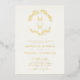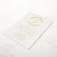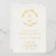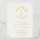 Trendy All in One Real Gold Foil Monogram Wreath Cream Wedding Invitation... The front of our trendy minimalist real gold foil wedding invitation features a metallic gold leafy botanical wreath displaying the bride's and groom's monogram initials above personalized invitation text in golden serif and sans serif typography on a delicate cream background. The cream back of the invitation contains all of the details you would typically see on separate cards in the wedding packet, including reception time and venue, accommodation options, wedding website, RSVP and gift registry information. All example text can be easily revised with your own information on the personalization template..