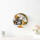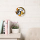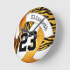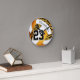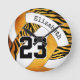 This wild zebra stripes girl's volleyball wall clock features a bold zebra stripes accent pattern on four of the volleyball's panels - the zebra stripes panels plus three other panels have an orange/gold background that contrasts with the remaining white volleyball panels - customize with player name and jersey number - by katz_d_zynes