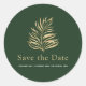 This modern Save the date sticker features your names and wedding date with pretty green background, gold effect palm leaf and "Save the Date" written in a matching gold elegant script.