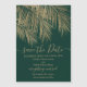 Modern gold palm tree elegant save the date. Modern simple faux gold palm tree with simple typography, a trendy and tropical save the date wedding theme on palm tree leaf with editable dark green.