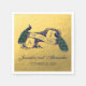 Gold and Blue Peacocks Romantic Wedding Paper Napkins. BlissfulWedding © at Zazzle. Two beautiful peacocks on vintage banner and text in a dark blue font all on a gold foil background (printed photo effect) with monogram initials, bride and groom first names and wedding date, create a unique, stylish napkins for the wedding reception or wedding shower. Other colours available.