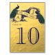 Gold Peacock Wedding Table Number Card. Elke Clarke© for BlissfulWedding at Zazzle. This gorgeous wedding table number card design is perfect for a romantic wedding with the ability to personalize with your monogram initials. Its unique design with two beautiful peacocks on vintage banner and text "Mr. and Mrs." in a dark blue font all on a printed gold foil photo effect background, create a unique, stylish wedding table number card. Please order one table card with the first number on it. Then change the number in the edit menu and add the next table number card to your cart until you have one unique card for each table number in your cart.