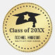 A personalized gold graduation sticker begins with a graduation cap with a gold star in the centre. Class of 2018 is written below. The graduate's name and then their school follows. A double row of dots frames the typography. The inner row of dots is larger and the outer row of black dots is smaller. The smooth gold background will look great on white envelopes or any colour party favour.