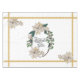 This pretty white tablecloth with gold trim on four sides features a wreath of gold and white poinsettia flowers, golden berries, and greenery. Black text in the centre of the wreath reads The Most Wonderful Time of the Year!