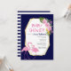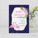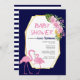 Gold foil polygon, flamingos and tropical flowers navy blue baby girl shower invitation. It features pink flamingos, tropical flowers and leaves. The text is in a white frame with gold foil polygon frame on nave blue background. On the back there is a striped pattern with navy blue and white stripes.