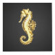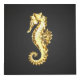 Artistic, polygonal, seahorse of sparkling, gold foil on black background.