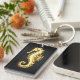 Artistic, polygonal, seahorse of sparkling, gold foil on black background.