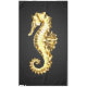 Artistic, polygonal, seahorse of sparkling, gold foil on black background.