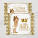 Prince baby shower invitation with gold background and adorable little prince wearing gold diaper and crown on a beautiful fancy gold background. This ornate gold prince baby shower invitation is easily customized for your event by adding your event details, font style, font size & colour, and wording. You can also change the background colour on this adorable prince baby shower invitation to perfectly match your theme.