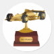 Shiny gold race car trophy sticker, with graphics of a gold tone race car on top of a trophy base, with custom text, on the plaque. Personalize the text to read anything you want. Perfect as birthday party favours or award stickers for a race car themed boy's birthday party.