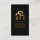 An all black minimalist cover features a set of faux gold lines near the card's centre. The upper gold dotted lines has a gold "home foundation rebar" logo you can use. This is followed by the business name which is broken up into 2 colours, one gold and one white. Just below this is a slogan caption to publicize your services, which you can change. Contact details are located near the base of the card.