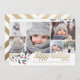 This whimsical and festive 6 photo holiday card features a photo collage, winterberries and says "happy holidays" in faux gold foil that is printed flat.