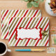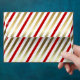 Gold, red, and white diagonal stripe envelope with a red and white banner you can address to your recipients, a gold and red jingle bell, and white envelope inside. We have matching greeting cards, return address labels, stickers, and postage stamps!