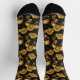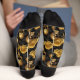 Gleaming gold skulls and matching gold roses make a unique and colourful pattern on these socks. Everything is placed on a dramatic black background.