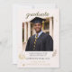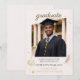 Academic portrait theme with warm gold accents on a soft cream background, featuring a centred graduate photo framed by subtle confetti details and small scholarly icons. Script and serif typography pair with a clean layout suited for college commencement announcements and campus celebration gatherings.