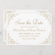 This elegant vintage-inspired formal wedding save the date card features the text in gold-coloured script and serif fonts, framed by a delicate vintage gold vine motif.
