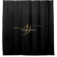A chic modern stylish gold black monogram on black shower curtain, with a dramatic script initial with swashes and your full name in a modern serif type,