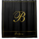 An elegant shower curtain with gold script type name and gold initial monogram overlay on a black background, with stylish typography.