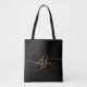 A chic modern stylish gold white monogram on black tote bag, with a dramatic script initial with swashes and your full name in a modern serif type,