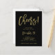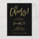 These modern, faux gold and black New Year's Eve party invitation postcards feature glam gold script typography that says "cheers!" This minimalist yet elegant design is the perfect way to invite guests to your New Year's Eve 2020 celebration.