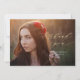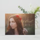 This pretty graduation thank you card features a full photo and modern calligraphy. The gold and white text overlay includes the phrase "thank you" written in elegant gold script, with the graduate's name and graduation year below in white. The typography overlays a full horizontal photo of the new grad. You can add additional photos and/or a custom message to the back of the card if desired.
