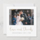 This simply chic photo wedding thank you card template features a crisp modern look and a distinctive square shape. We've given this minimalist design a splash of panache with 'love and thanks' below the photo in an elegant gold tone called California Gold in a flowing script in all lower case that lends a warm, familiar accent. This part of the design cannot be altered. You can easily edit the other text not just to show your own details but also suit your taste, picking your favourite colours and fonts. The names and date text on the front are a very dark grey that's in fact mostly black, and we've chosen dark grey for the text on the back. We've put some sample text on the back for you to replace with your own message. But please don't feel restricted by this. If you prefer delete our sample text and keep the back totally blank so that you can write a handwritten note on each card instead, you can do that. Or you might want to replace our text with your own message of gratitude and your own closing and then hand sign your names when you receive the cards. While our sample text is all upper case, you can of course change this, as well as changing the font and text colour when you edit our text and add your own. Just please be sure in any case to delete our sample text on both sides of the card, as well as our sample photo! The default background on both is transparent so that the colour of the paper will simply serve as the base tone. You can change this by picking a colour for one or both sides in the editing tools if you'd like. Use the intuitive design tools, your favourite photo and your inspiration and make it uniquely yours! And please browse our wedding thank you collection for a version of this card with the 'thank you' script in black, as well as other simply chic modern wedding thank you cards.