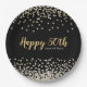 Add your own special touch to this elegant custom anniversary party plate design featuring sparkly gold and silver confetti over a black background, modern script typography with the words "Happy 50th" and the couple's names.