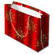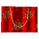 An elegant, decorative red and gold Christmas gift bag with a luxurious pattern of metallic gold Christmas snowflakes (or Christmas stars) over a stylish and festive red background.