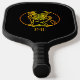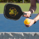 Pickleball paddle features round gold sphinx and customizable text on black background. Personalize with name or monogram