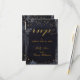 Une carte d'encastrage R.S.V.P. faire-part de mariage noir et or avec une aquarelle noire avec des taches d'encre dorée, qui rappelle un ciel nocturne au milieu d'étoiles dorées scintillantes. Une calligraphie classique en or anglais pour vos noms avec des petites lettres bloc pour les détails.
