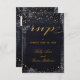 A black and gold wedding invitation R.S.V.P. enclosure card with a meal choice option, featuring a black watercolor with splatters of gold ink, reminiscent of a night sky amidst sparkling gold stars. A classic gold English script calligraphy for your names with small block lettering for the details.