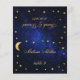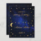 A celestial wedding place card with the guest name and the table number printed on its front and the bride and groom names and the wedding date printed on the other side (that is the other half, before folding it). All text is golden calligraphic script. The background is the night sky with the moon and stars around the text. The moon and stars are faux gold foil.