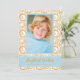 Transparent powder blue block over gold swirled design with your greeting and names in chic fonts. **ADD MORE PHOTOS or details on the back with the CUSTOMIZE further link. Select Matte for heaviest paper and high definition for best print quality. Other colours available in our store.