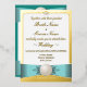 Invite your guests to your wedding with a beautiful custom wedding ceremony and reception invitation. This flat card features a pristine pearl and ribbon design on a rich reflective gold background. The card has front and back full colour printing. Although this invitation would be a wonderful touch to any season, the cool teal and shiny gold colours as well as the elegant pearls would beautifully fit a winter or beach wedding. All of the important information regarding your wedding is elegantly displayed on the front of the invitation. Be sure to include the names of the bride, groom and venue. The date and location where the ceremony will be held will also appear on the front of the card. All of your reception information can be elegantly displayed on the back of the card. The reception name and location appear on the back of the card. Additionally, you can include your wedding website or email at the back of the card. Please be aware that the shiny gold foil only appears on the front of the card. The back of the card features a deep teal background.