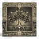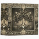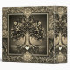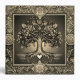 A beautiful ornate design with a gold tree of life with an ornate frame and a heart at the roots. There is a night sky background.